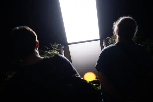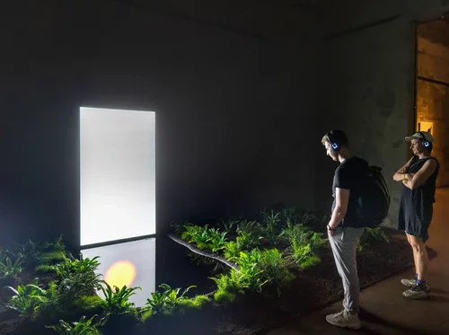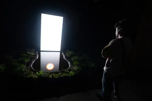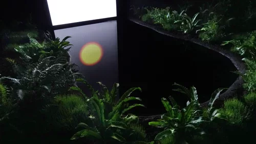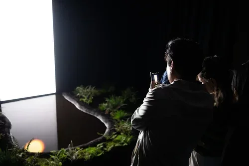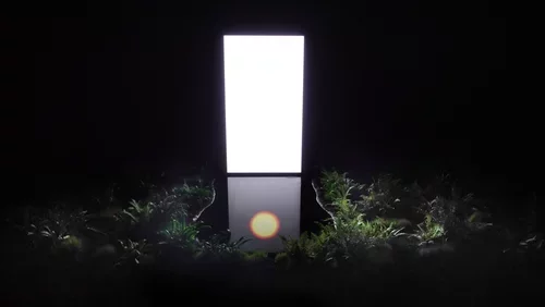 À l'œil nu, l'écran n'émet qu'une lumière blanche. Le film polarisant de l'écran LCD ayant été retiré, le contenu n'est visible qu'à travers le reflet sur l'eau, qui agit comme un filtre polarisant naturel grâce au phénomène de l'angle de Brewster.